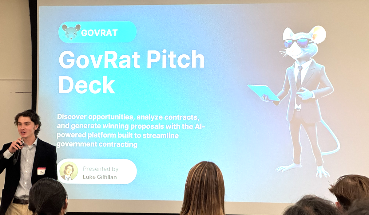 Founded in 2023, GovRat is an AI-powered platform that helps small businesses compete more effectively for government contracts by simplifying the public procurement process. The company currently serves about 100 customers, ranging from one-person firms to companies with more than 150 employees. Luke explained that the idea for GovRat was born from his internship experience in Congress. “I had a project related to public procurement and how to modernize it on the government side,” he said. “I found that it would be too hard to modernize it on the government side, so instead, I came up with a private-sector solution to give businesses the tools they would need to compete effectively.”