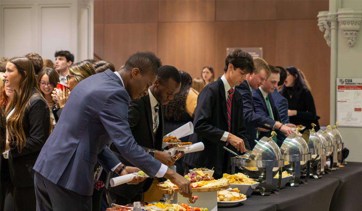 The event, held in Maloney Hall, provided students with the opportunity to engage with representatives from a wide range of industries and organizations, including the Washington Wizards, EY, Kaplan, and Forvis Mazars. The evening began with mock interviews and transitioned to a networking reception, allowing students the chance to practice their elevator pitches, sharpen their communication skills, and put their preparation into practice through real conversations with employers.
