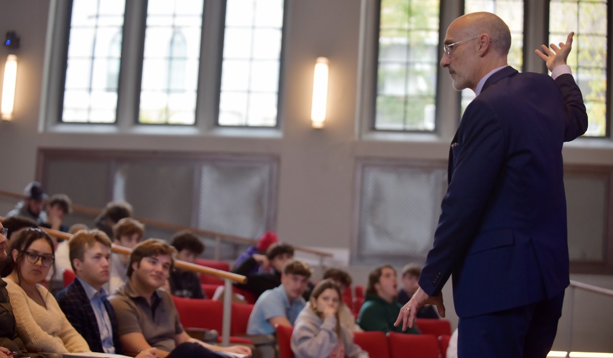 Social scientist and Harvard Business School professor Arthur Brooks, 2023 Commencement keynote speaker and honorary degree recipient, returned to The Catholic University of America to share the secrets to a successful life as a guest lecturer during a Busch School of Business course on Nov 1.